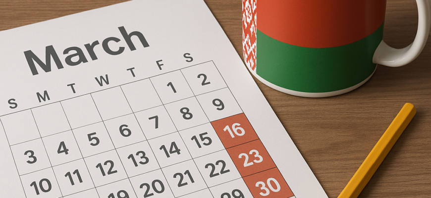 Таким образом, март 2026 года в Беларуси ожидается с умеренной трудовой нагрузкой и возможностью полноценного отдыха, в зависимости от выбранного графика работы.